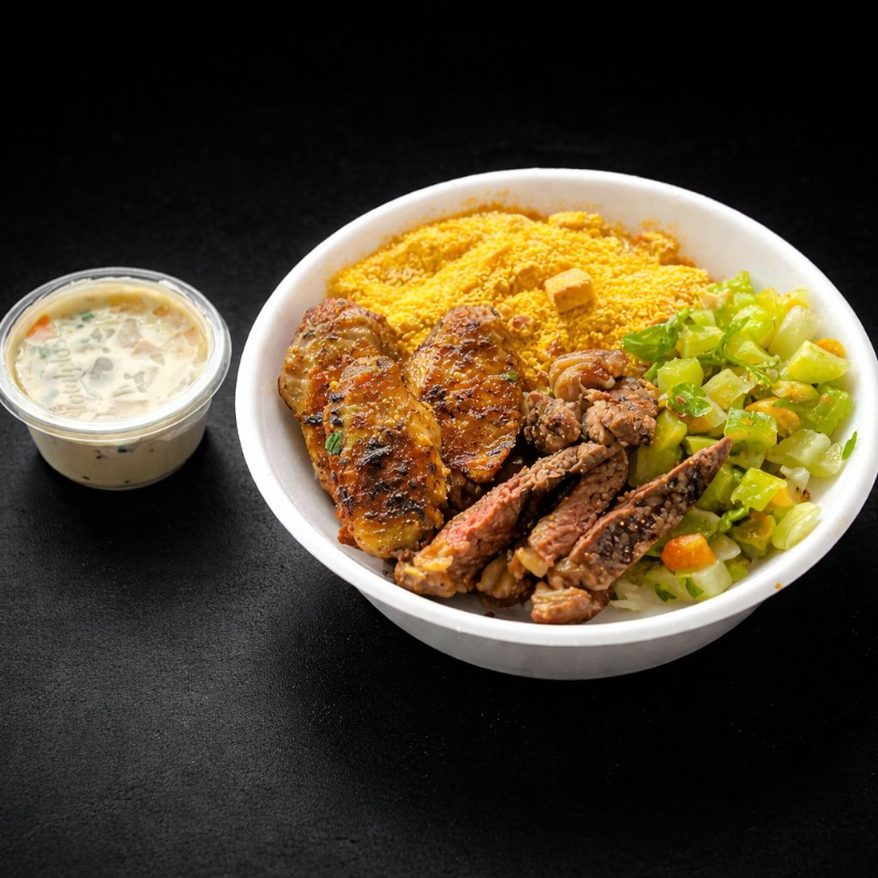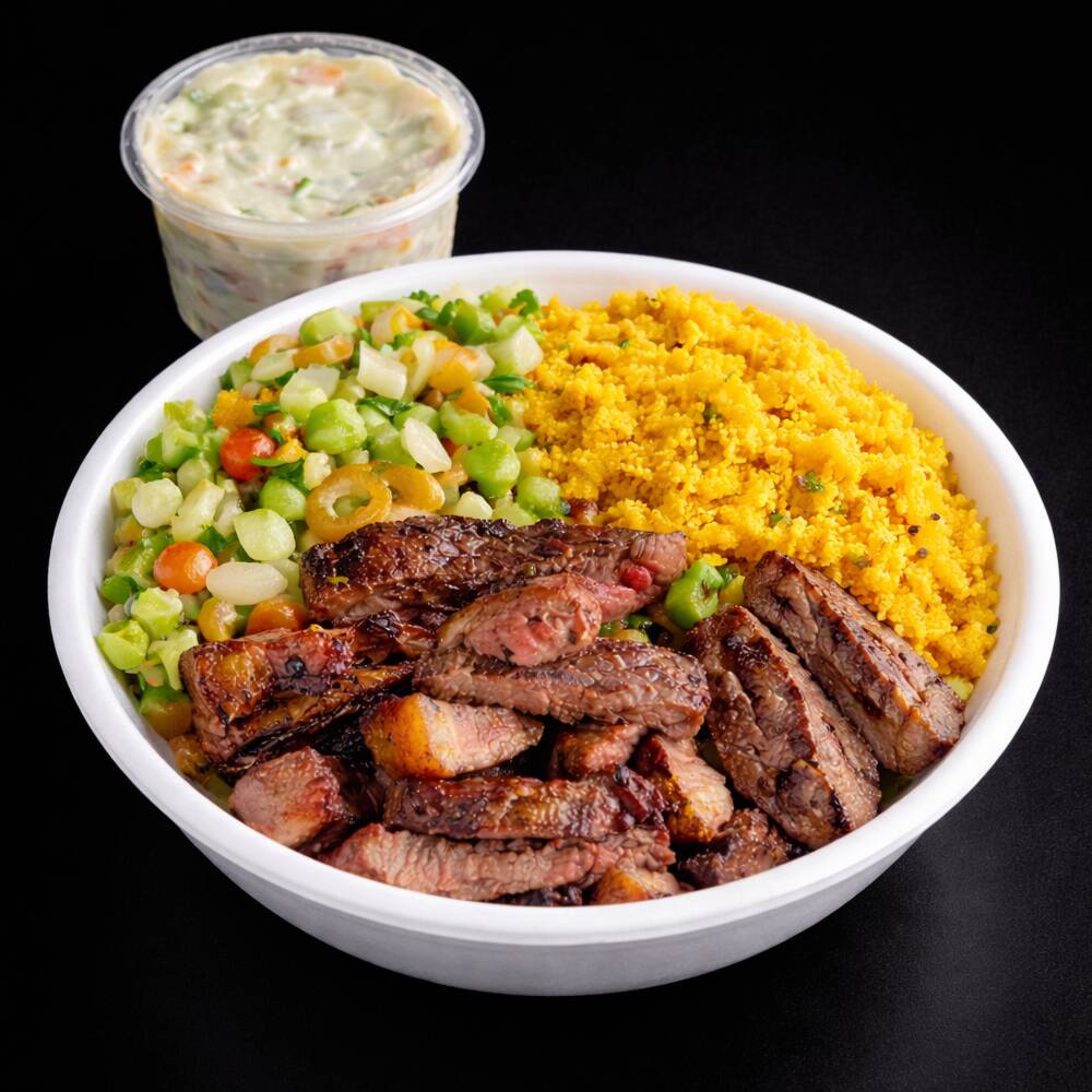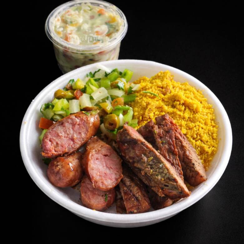 Escolha ate duas opções de churrasco acompanhado de um arroz branco soltinho ,salada de maionese vinagrete e farofa.