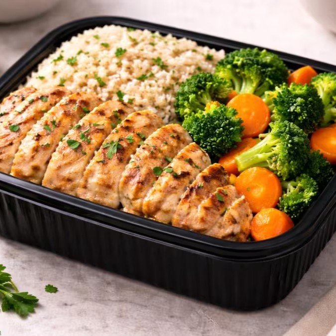 Filé de frango grelhado , com legumes( Brócolis e Cenoura )e arroz integral. Porção de 350g aprox.