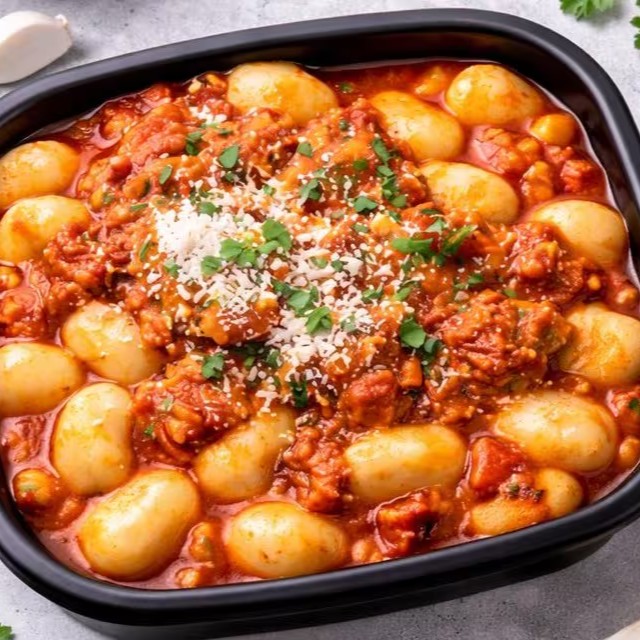 Nhoque feito com Batatas selecionadas , servido com molho de tomate caseiro á bolonhesa ,porção contem 450g aprox.