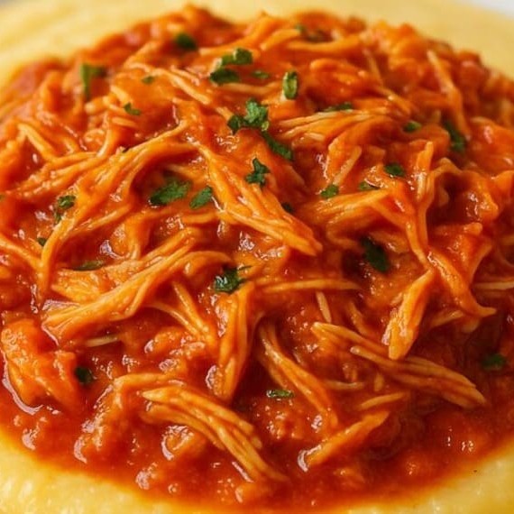 Deliciosa Polenta Cremosa Acompanhada De Molho De Tomates E Frango Desfiado Temperadinho Coberto Com Queijo Parmesão (Aproximadamente 500g)