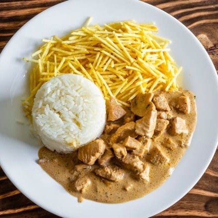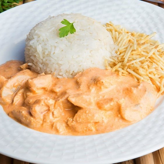 Delicioso frango em tiras grelhado envolvido em molho a base de creme de leite e especiarias com laminas de champignon acompanhado de um arroz soltinho e batata palha ou fritas, você escolhe!!