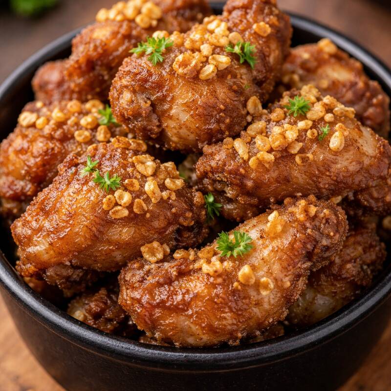 Delicioso frango frito a passarinho salpicado de alho frito