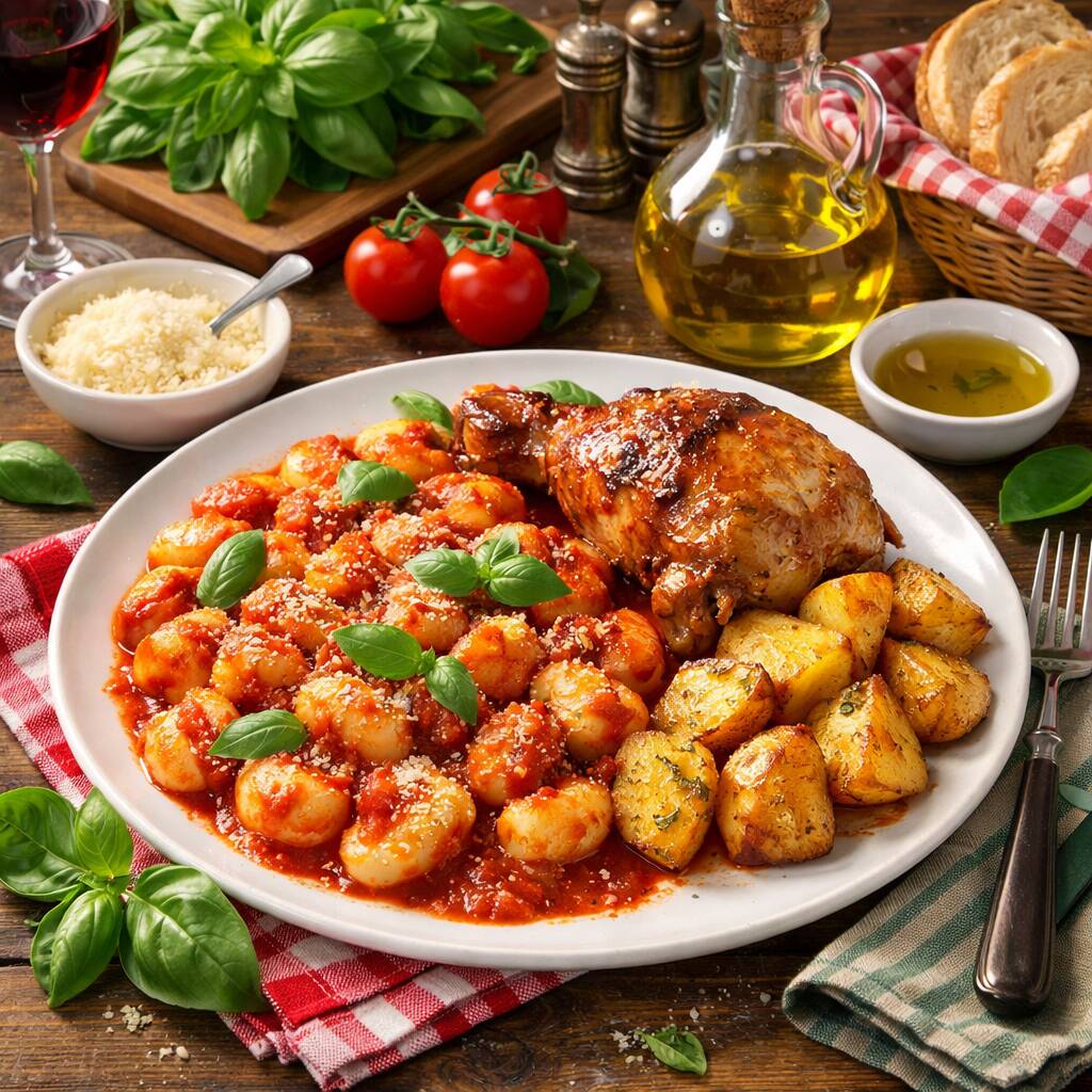 Delicioso Nhoque a Bolonhesa finalizado com queijo derretido acompanhado de uma deliciosa sobrecoxa assada suculenta e batata corada. Para finalizar essa deliciosa refeição uma coca-cola geladinha
