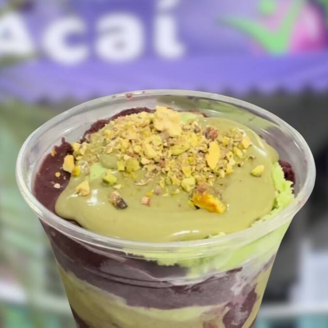 Prepare-se para uma explosão de felicidade em cada colherada! Experimente nosso irresistível açaí com com recheio de pistache trufado. Fica ligado: Todos os itens vão dentro do copo de 500ml