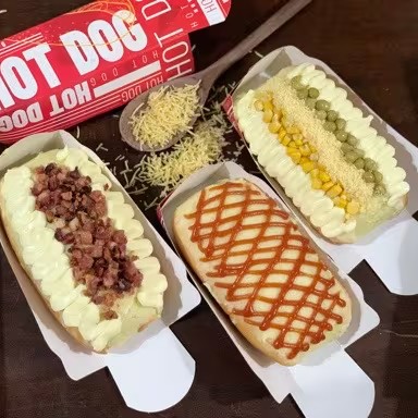 Composto por pão para hotdog,maionese hellmans,uma salsicha (sadia),catchup e mostarda (hellmans), milho, ervilha, vinagrete(tomate,salsinha e cebola), batata palha e purê de batatas caseiro fresquinho.
