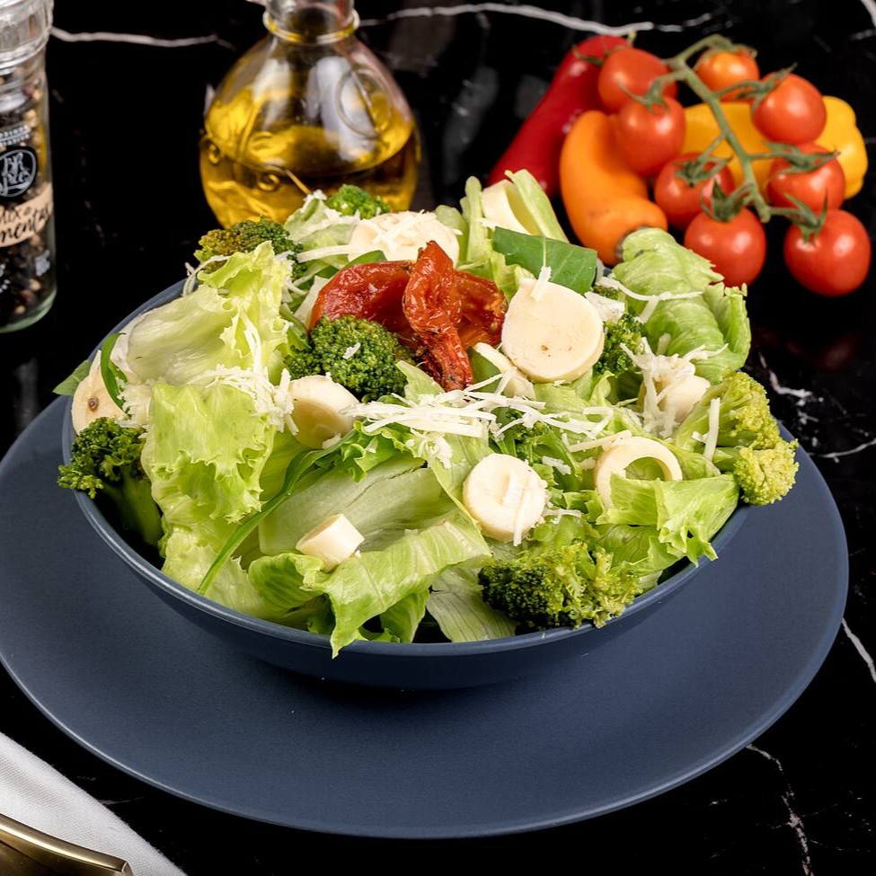 Alface americana, rúcula, tomate seco, palmito, brócolis e parmesão.