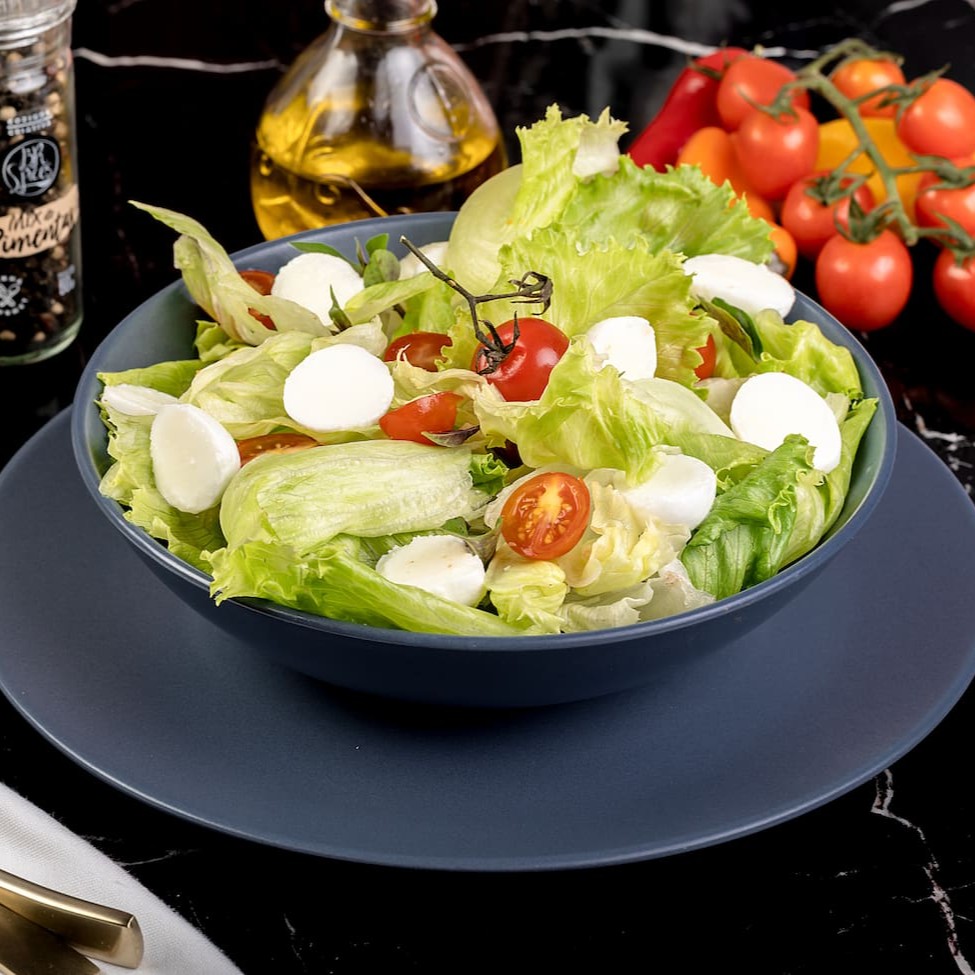 Alface americana, tomate cereja, mussarela de búfala, manjericão, e pesto (manjericão, azeite e tomate).