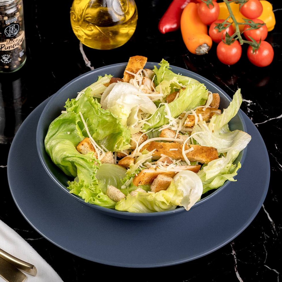 Salada mista com alface crocante, frango grelhado suculento, tudo envolto em um cremoso molho Caesar, finalizada com croutons crocantes e parmesão.