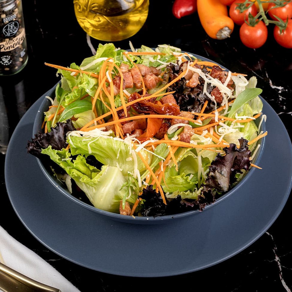 Alface americana, alface roxa, rúcula, cenoura, bacon cubos, parmesão, tomate seco.