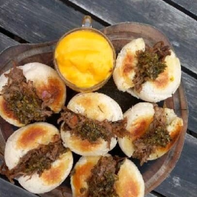 6 mini sanduiches, no pão bolinha, com recheio de carne de boi assada e desfiada. Hummmm!
