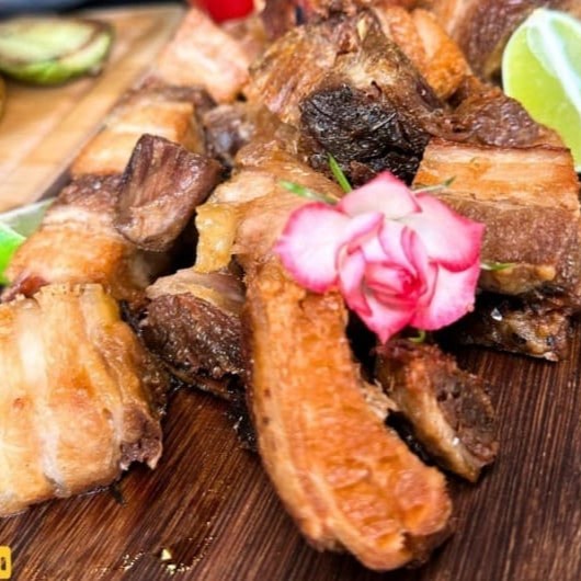 10 pedaços de corte suíno, assado e defumado, depois dourado no óleo. Acompanha batata bolinha artesanal.