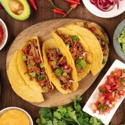5 tortillas de milho (taco shell) + sua carne preferida + Guacamole + Pico de Gallo + Sour Cream + creme de queijo + chilli beans... Ahhh vai tudo separado pra experiência ser a melhor possível.