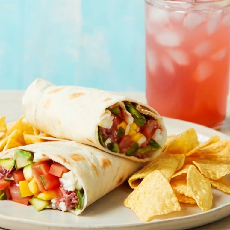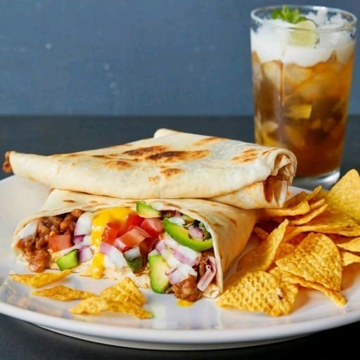 Mini Burrito (2 unidades, montado na tortilla de 20cm) + Totopos (50g) + Pink lemonade ou chá gelado.