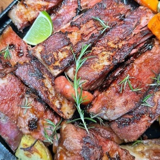 5 ripas de costelinha suína levemente defumada com Pico de Gallo e legumes na parrilla.