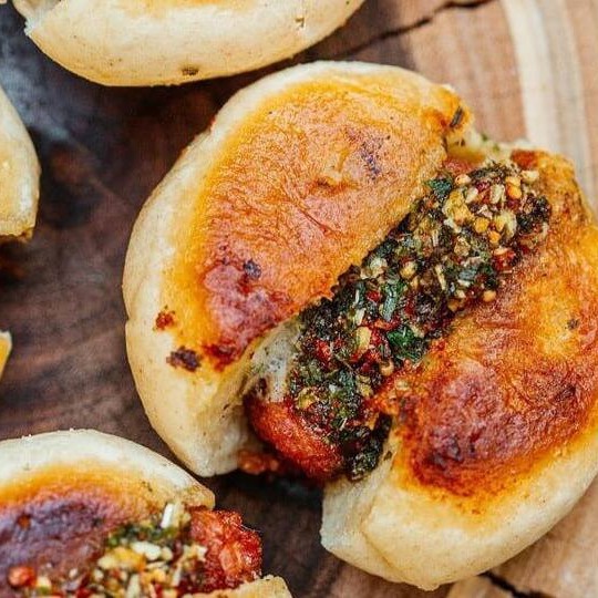6 mini sanduiches, no pão bolinha, com linguicinha especial de pernil e chimi churri da casa. Hummmm!