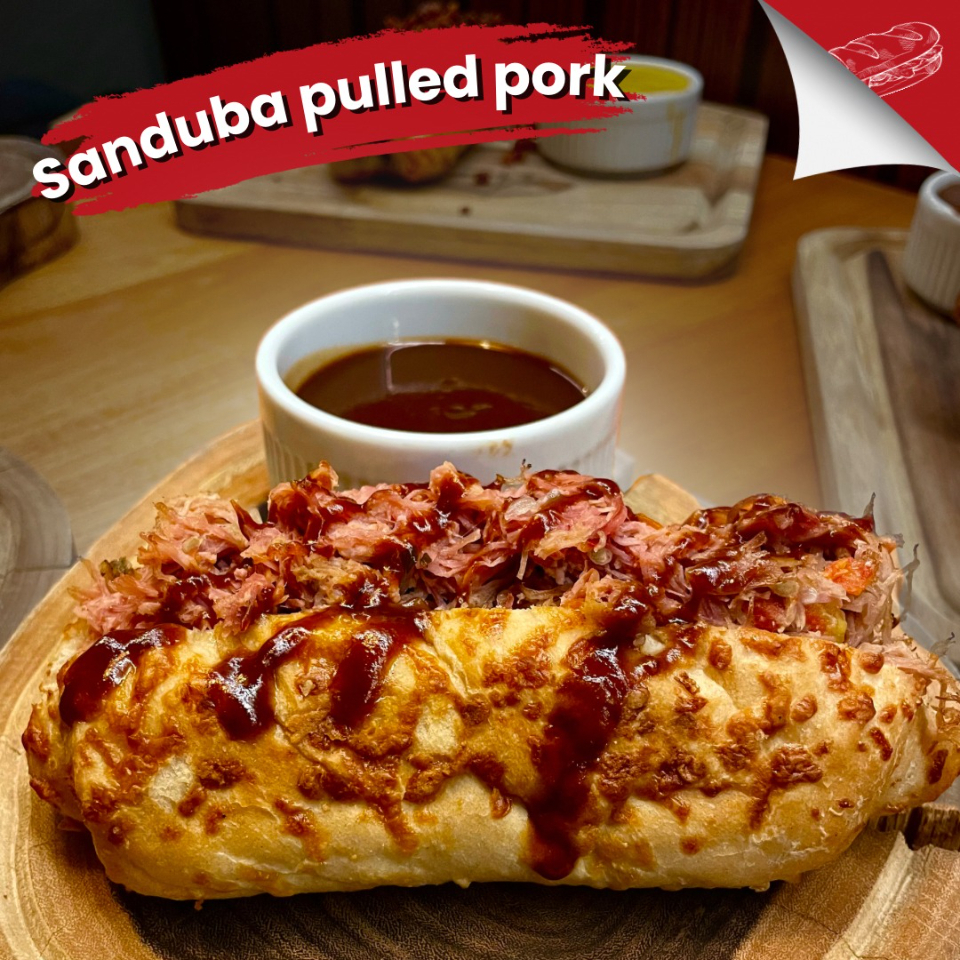 Pernil defumado e desfiado na baguete de parmesão, com barbecue da casa. Um estouro!