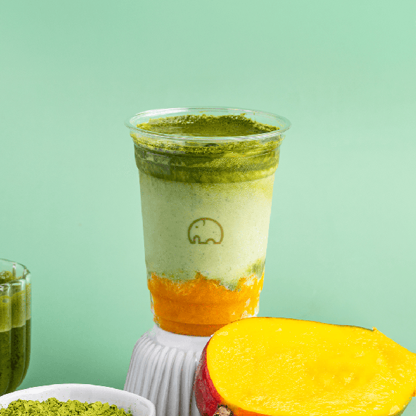 Bebida gelada de leite com matcha e pedaços de Manga. 330ml