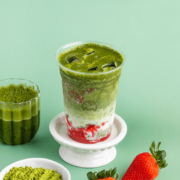 Bebida gelada de leite com matcha e pedaços de Morango. 330ml