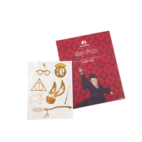 Pack de tatuagens temporárias Harry Potter com ícones clássicos da saga, perfeito para festas, cosplay e fãs
