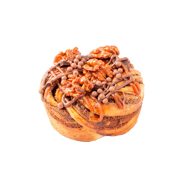 Massa macia com canela, com cobertura de caramelo salgado, creme de chocolate com avelã, nozes caramelizadas e Crocante de chocolate