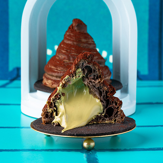 Massa folhada com recheio e cobertura de ganache de chocolate e creme de chocolate e avelã