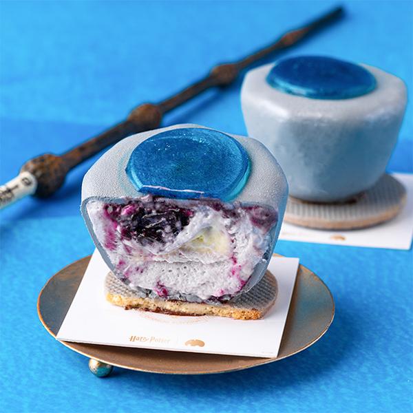 Mousse de mirtilo com um toque de limão, para remeter à sobremesa favorita de Dumbledore, os sherbet lemons, recheada com creme de limão e confit de mirtilo, finalizada com gelatina de limonada azul.