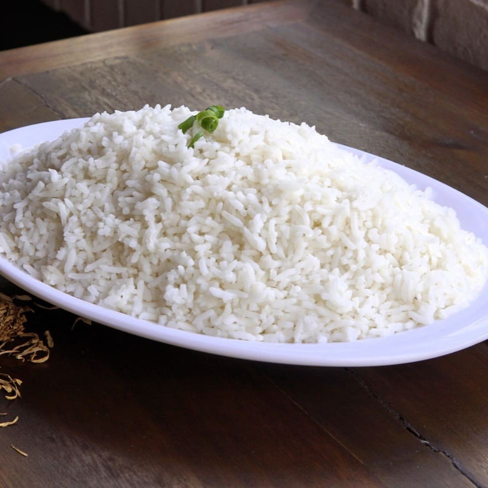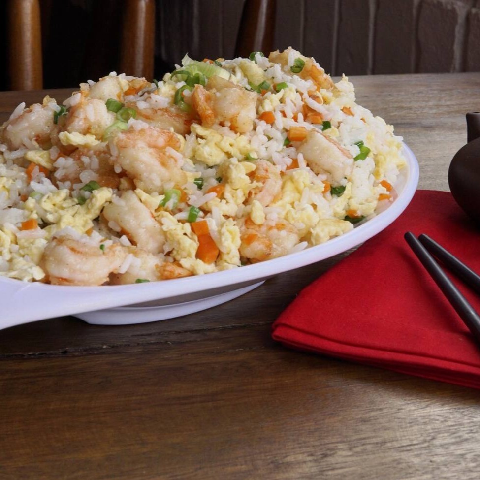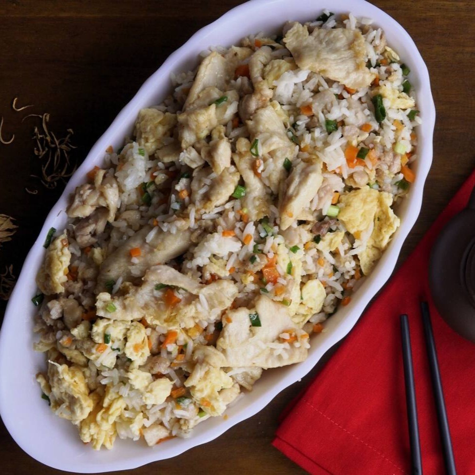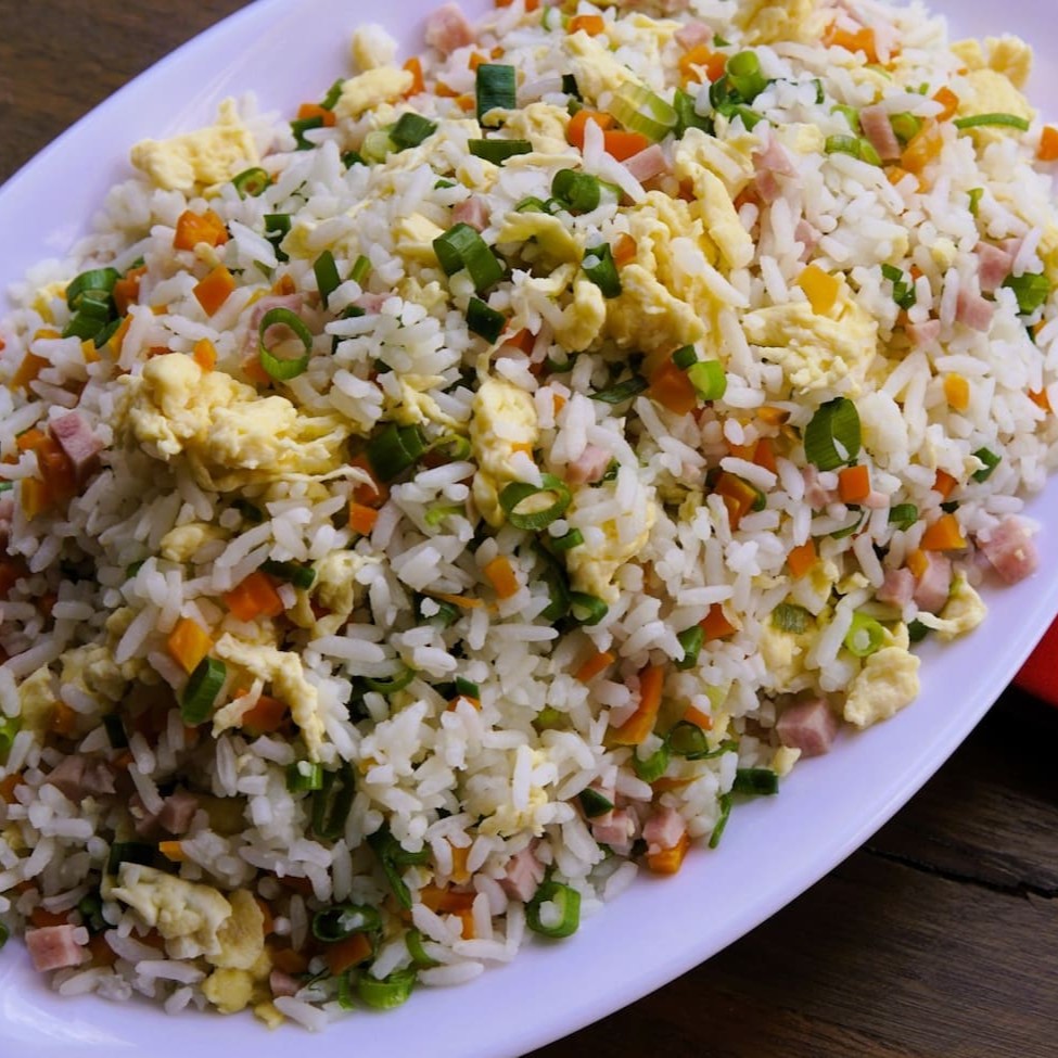 Risoto estilo Chop Suey, com ovos mexidos, cenoura, presunto e cebolinha, trazendo uma fusão de sabores orientais e ocidentais.