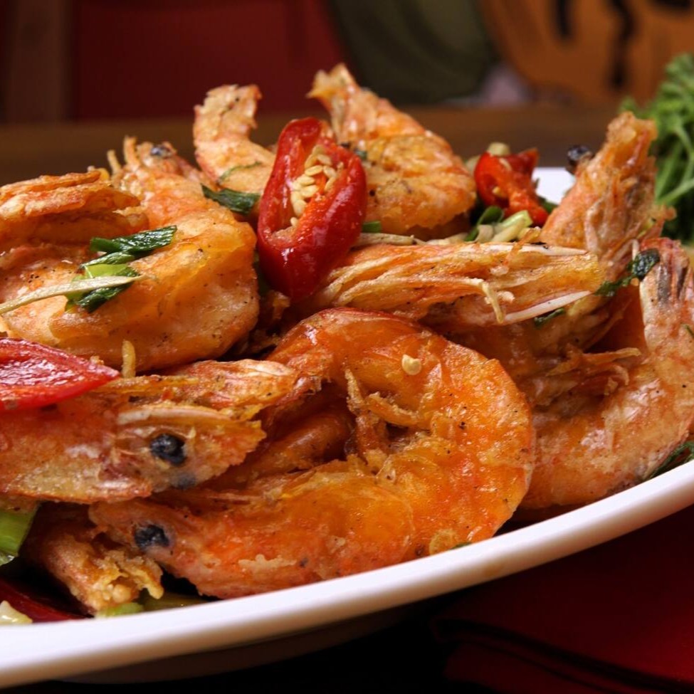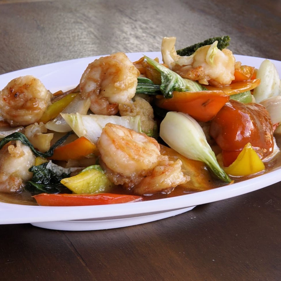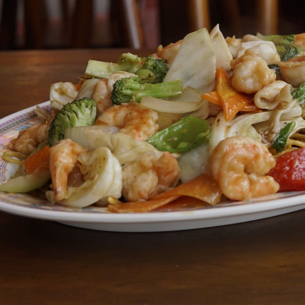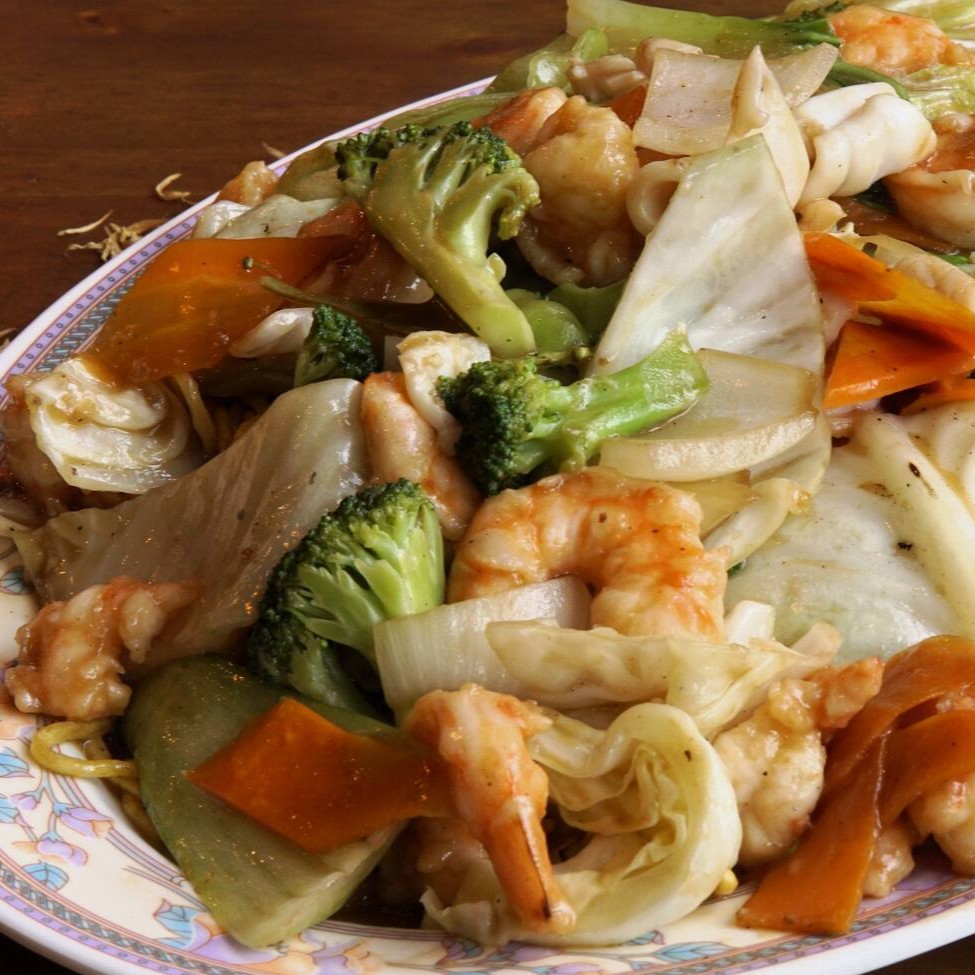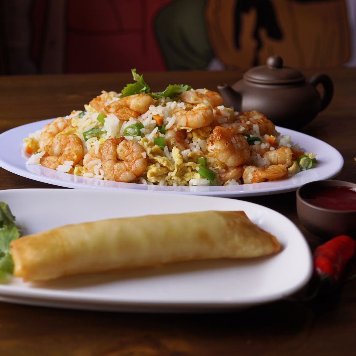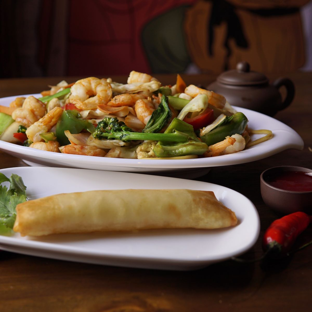 Camarões suculentos e legumes frescos em um yakisoba irresistível, acompanhado de um rolinho.(800g aprox. no porção executivo)