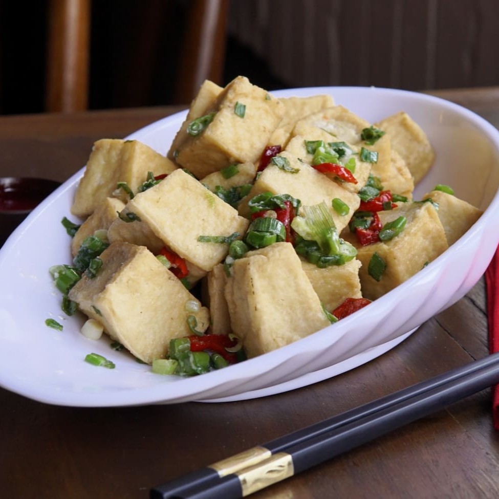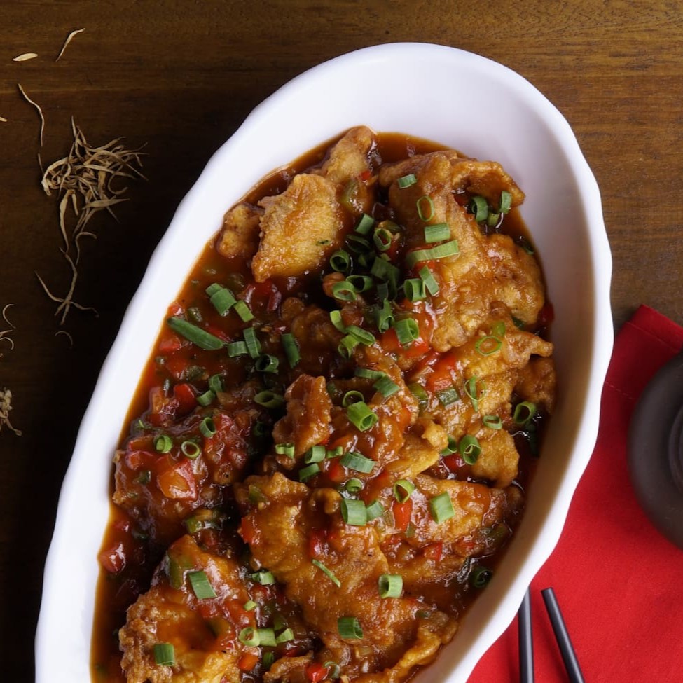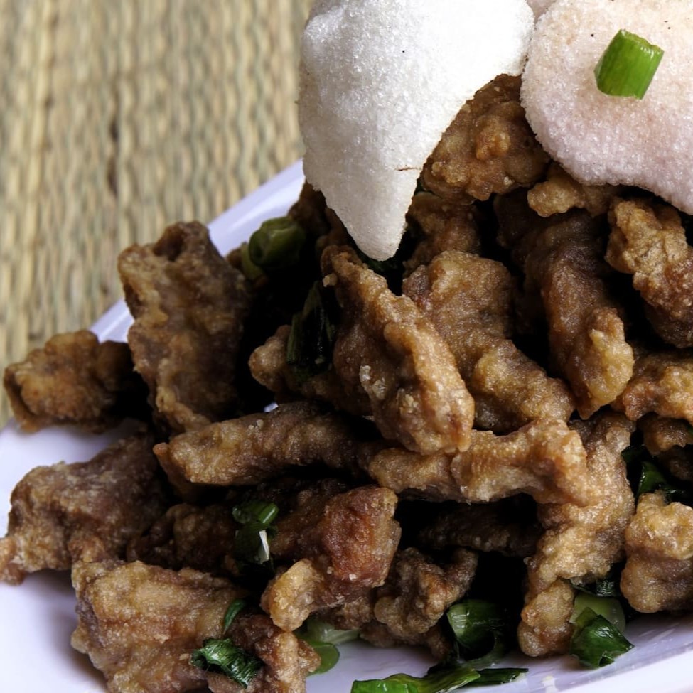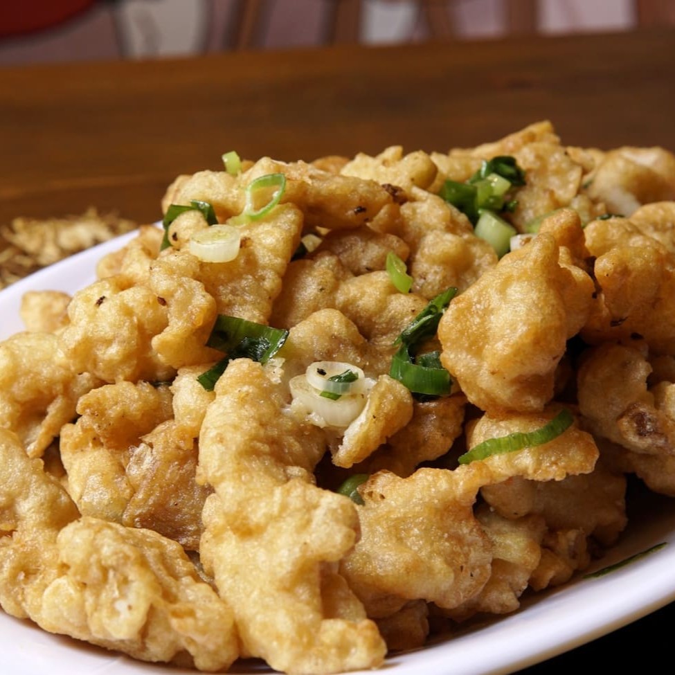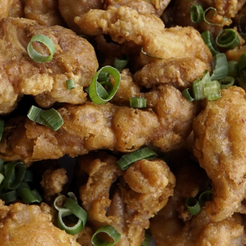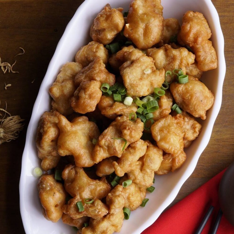 Delicie-se com o frango desossado frito, salteado ao alho e cebolinha, uma combinação aromática e saborosa.