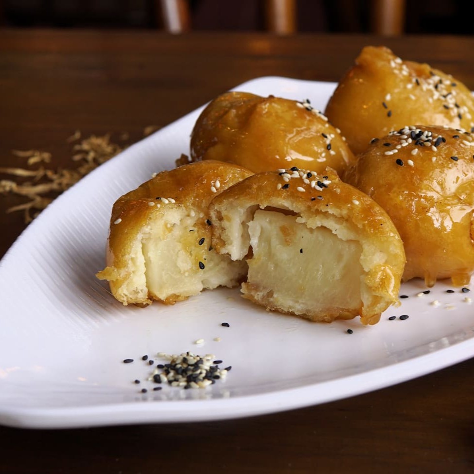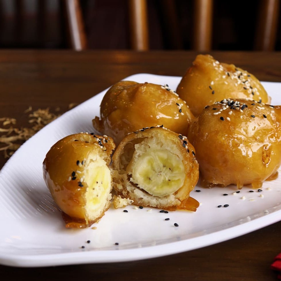 Abacaxi envolto numa massa frita caramelizada na sequência.