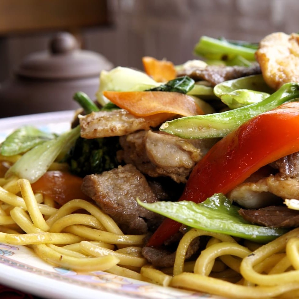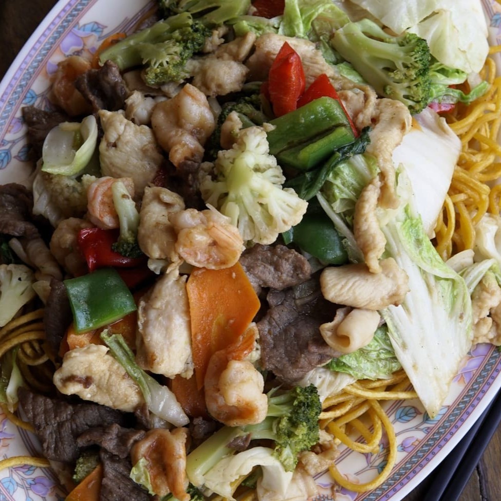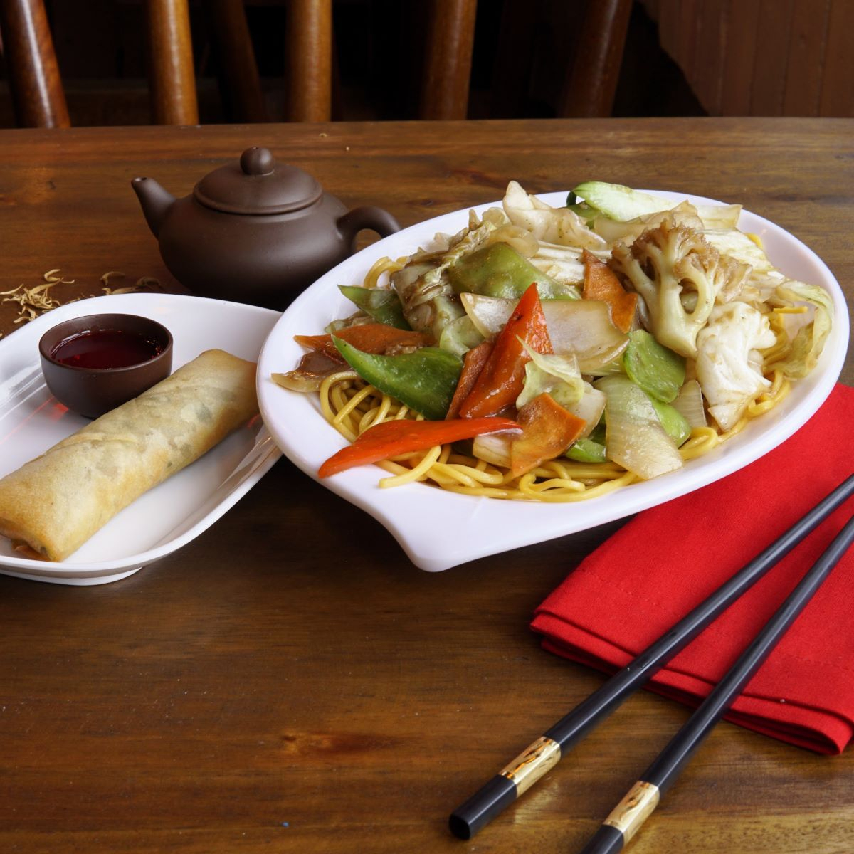 Macarrão frito clássico com misto de legumes, carne e frango, acompanhado de um delicioso rolinho. (800g aproximado no porção executivo)