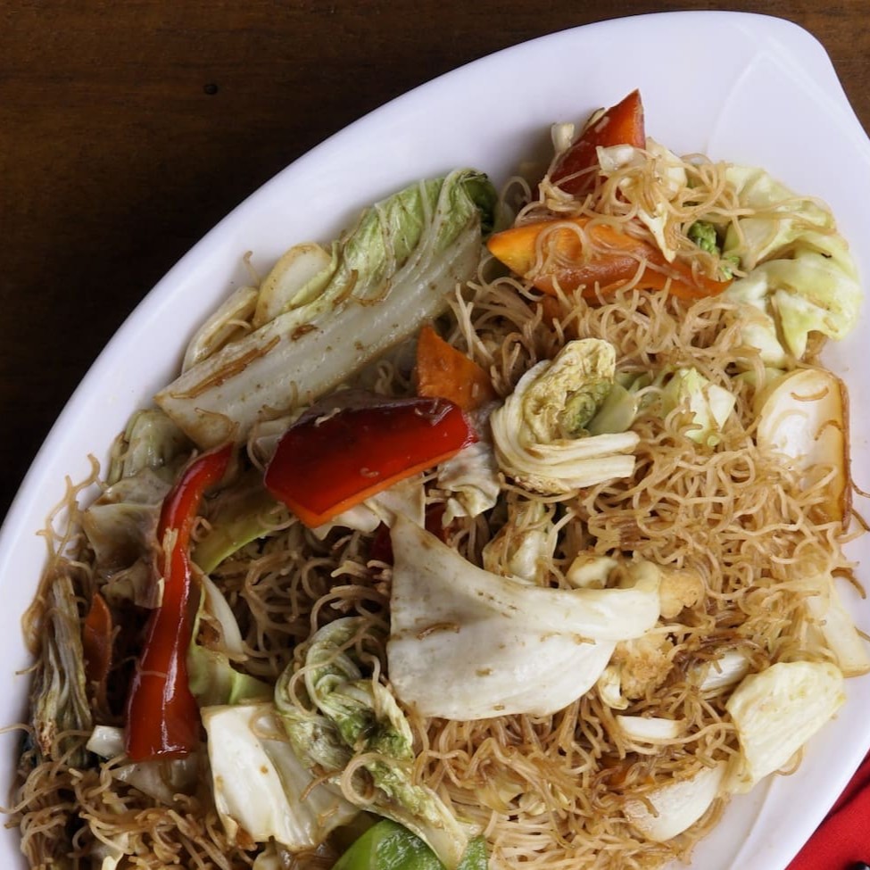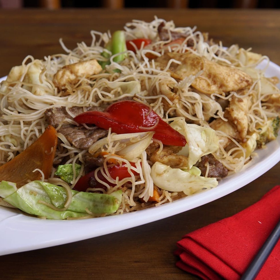 Bifum frito com carne, frango e legumes, criando uma combinação deliciosa e equilibrada de sabores e texturas.