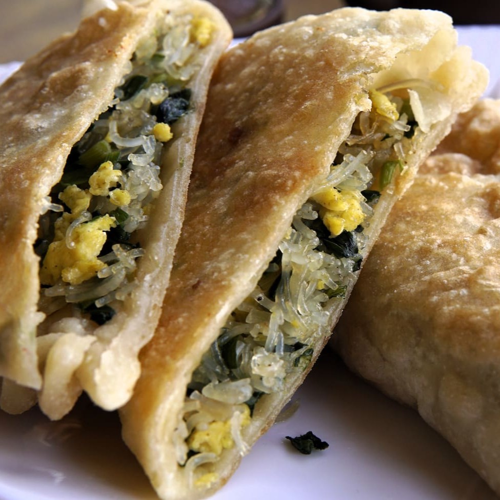 Pastel frito recheado com nirá, uma opção crocante e saborosa, ideal para quem busca algo diferente.