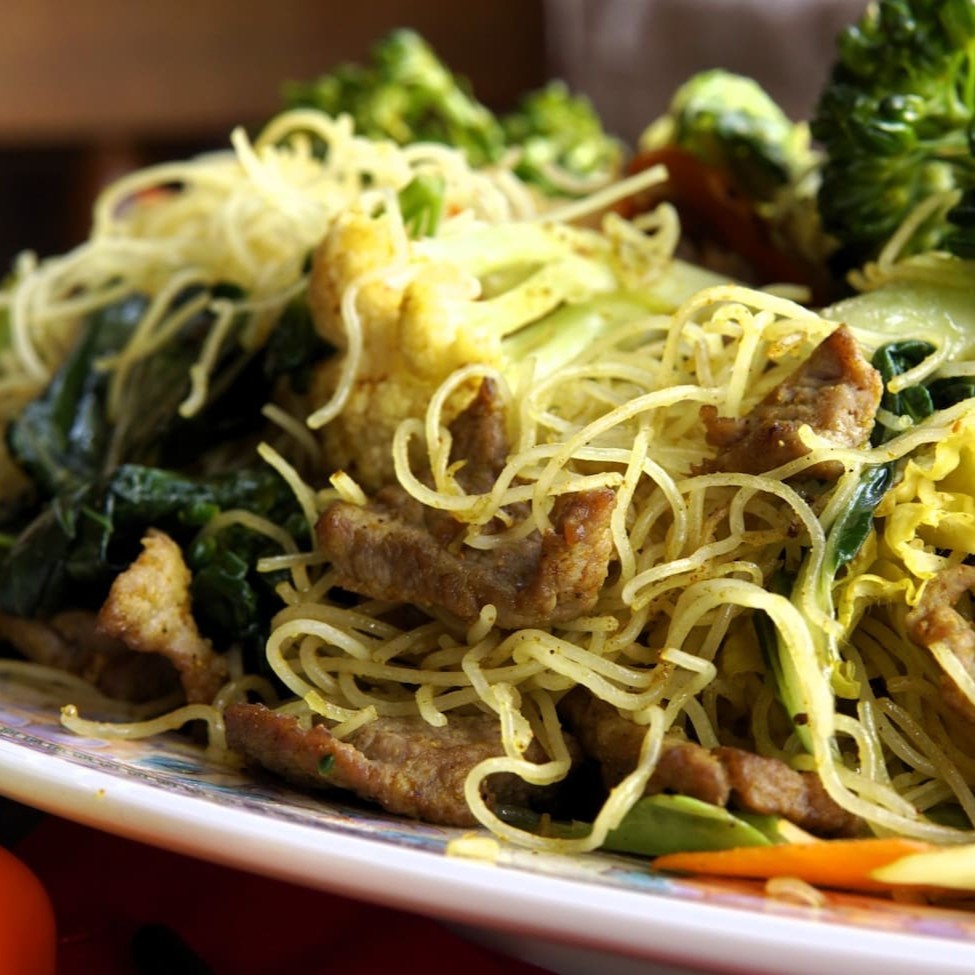 Bifum frito ao curry, com carne e legumes, proporcionando um prato aromático e picante, perfeito para os amantes de sabores intensos.