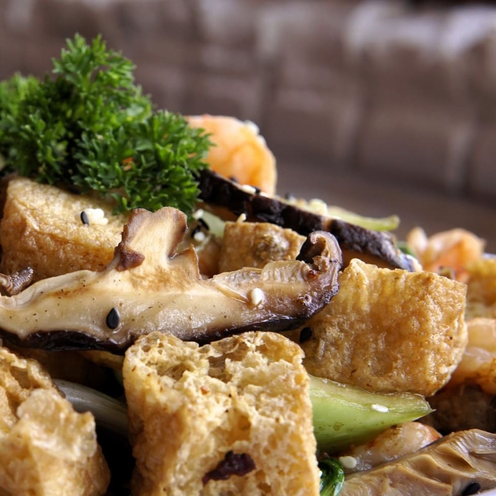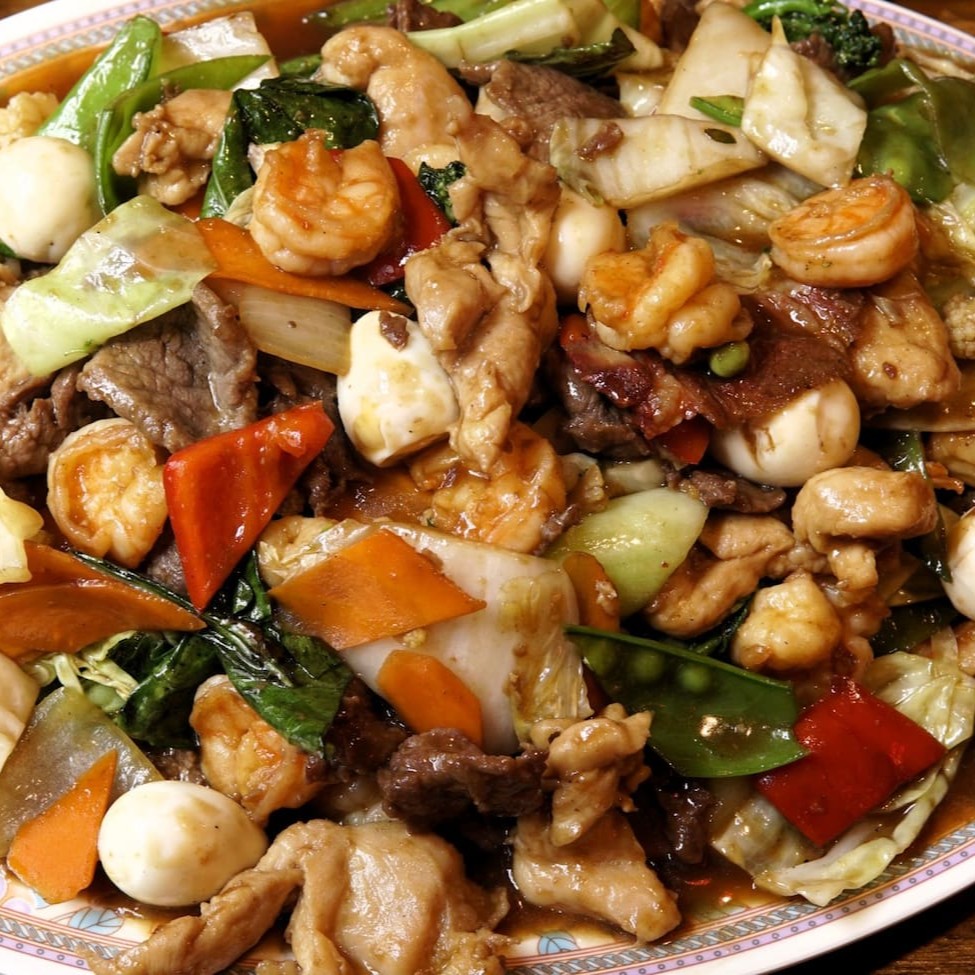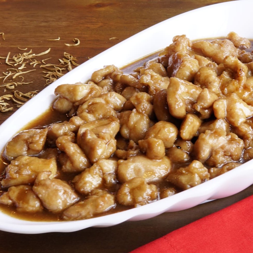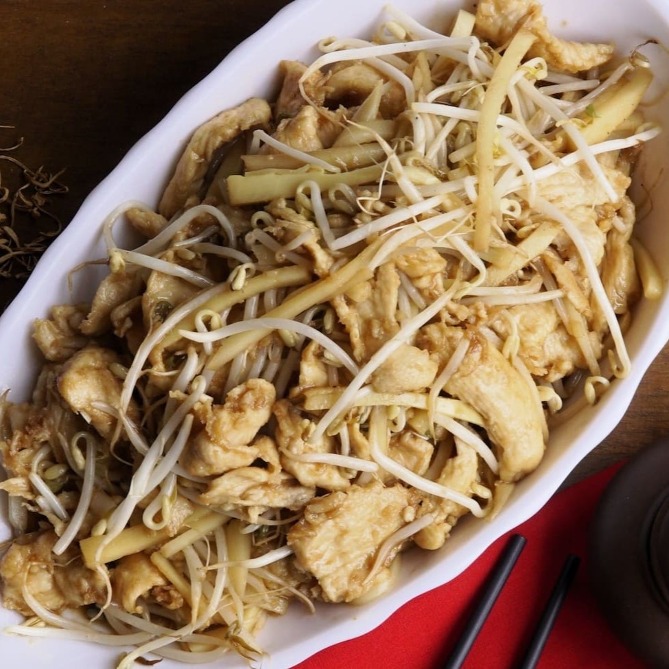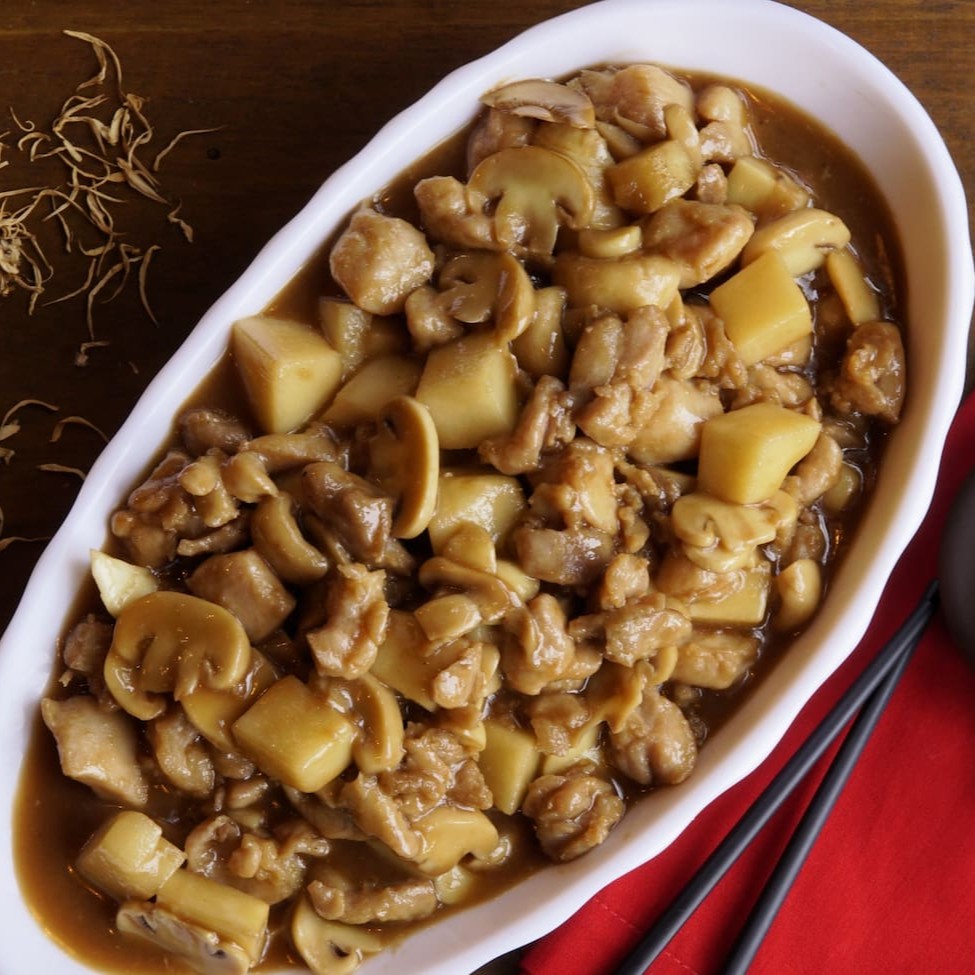 Desfrute do Frango Xadrez com cogumelos e broto de bambu, uma combinação exótica que eleva o prato a um nível gourmet.