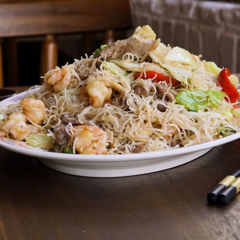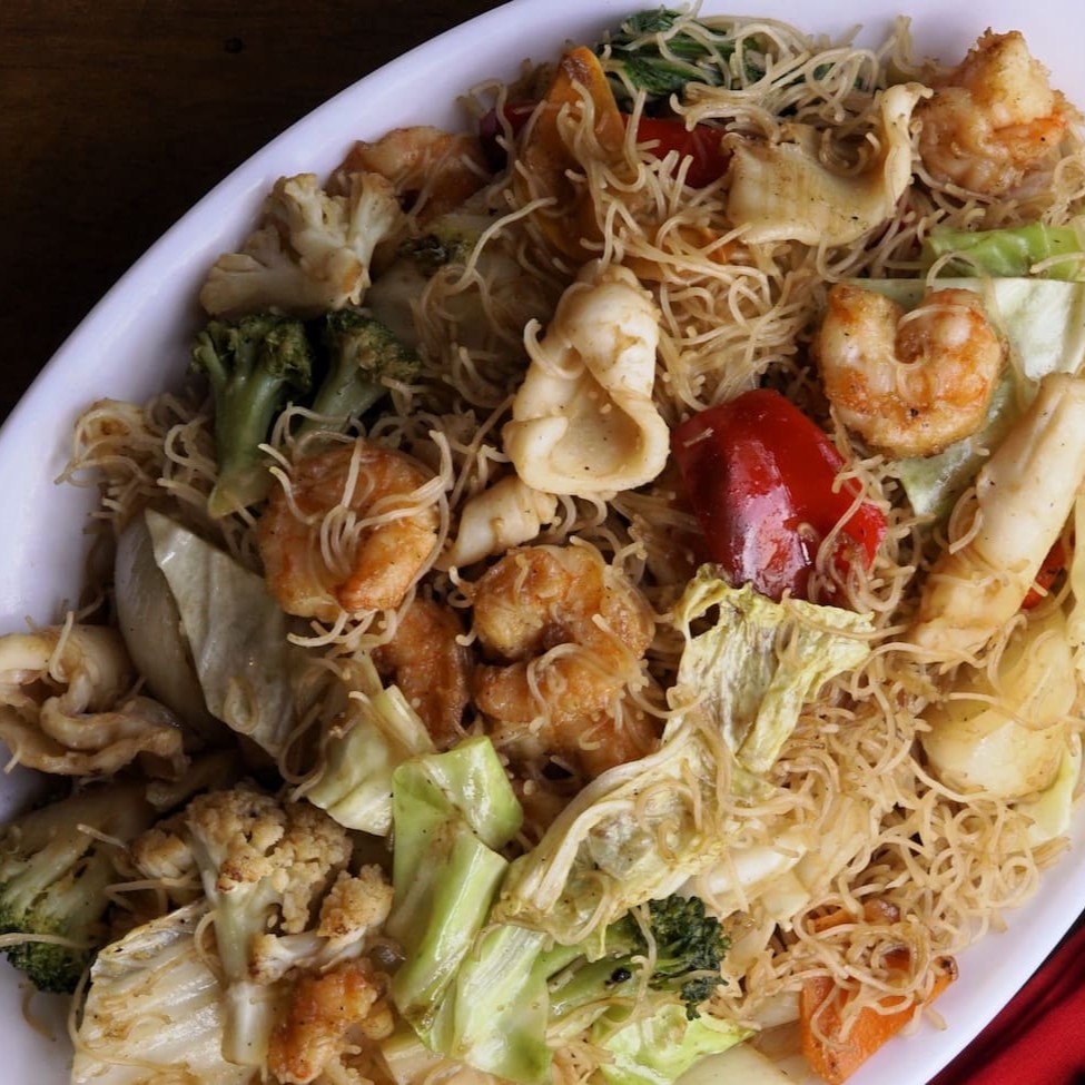 Bifum frito especial, com uma combinação de frutos do mar, carne, porco, frango e legumes, oferecendo uma experiência gastronômica completa.