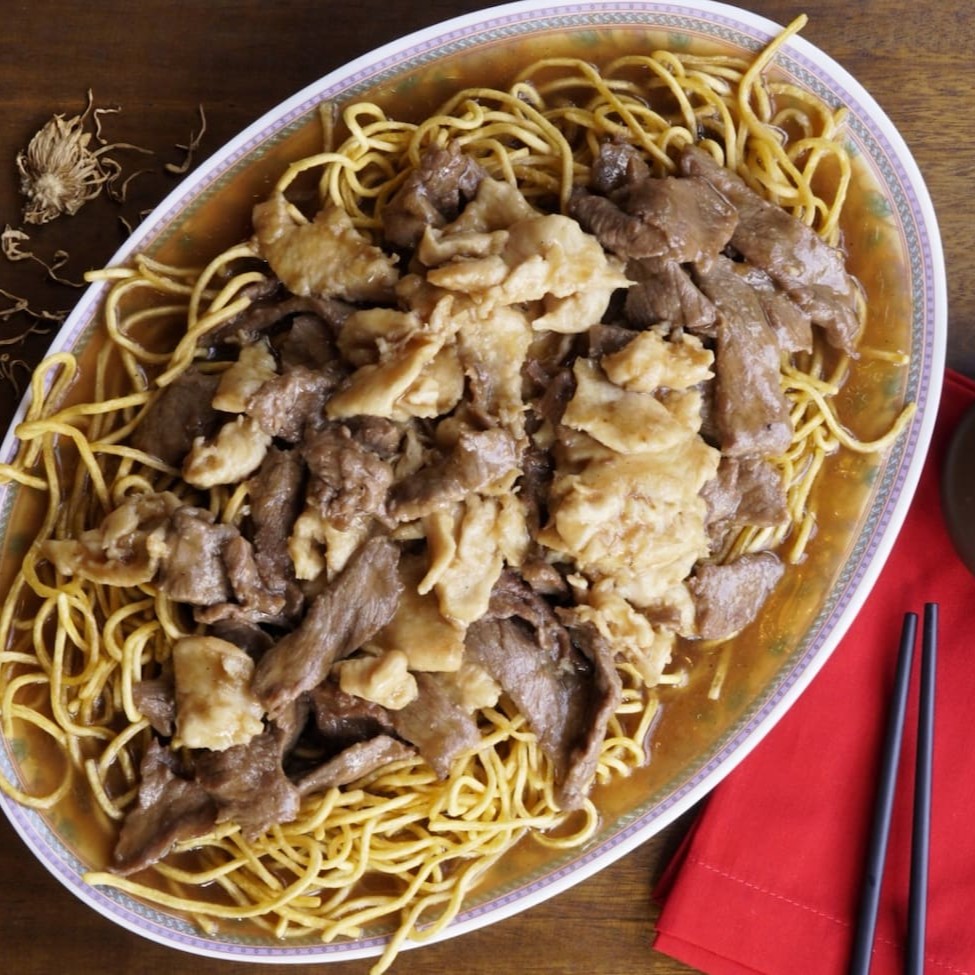 Yakisoba estilo Chop Suey, com uma mistura de legumes, carne e frango, oferecendo uma experiência de sabor completa e equilibrada.