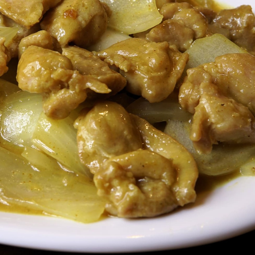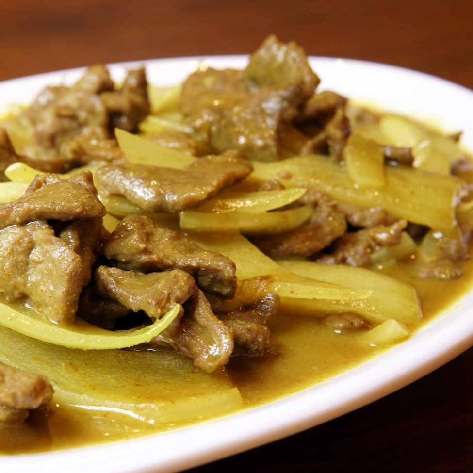 Experimente a carne fatiada suculenta, mergulhada em um molho curry aromático que oferece uma experiência exótica e envolvente.