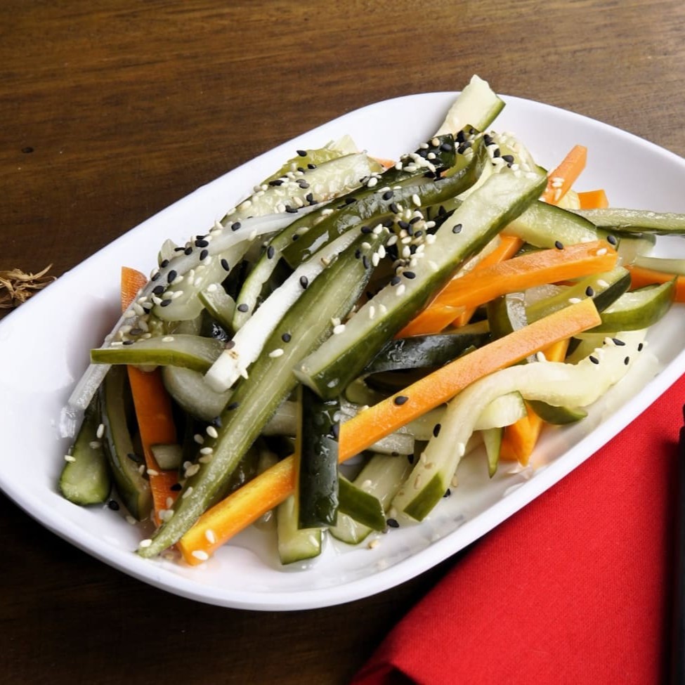 Pepino em conserva, marinado em molho shoyu com alho e pimenta, uma explosão de sabores em cada mordida.