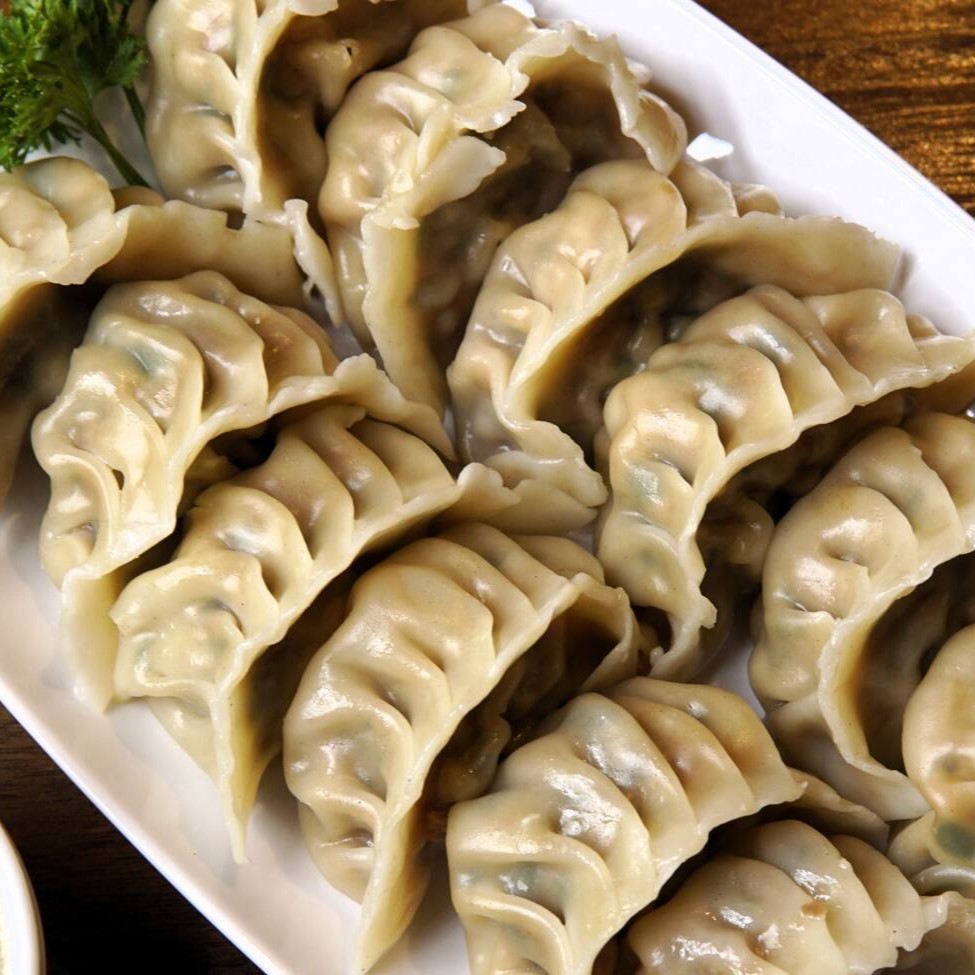 Gyoza cozido, recheado com porco e nirá, oferecendo um sabor autêntico e suculento em cada mordida.