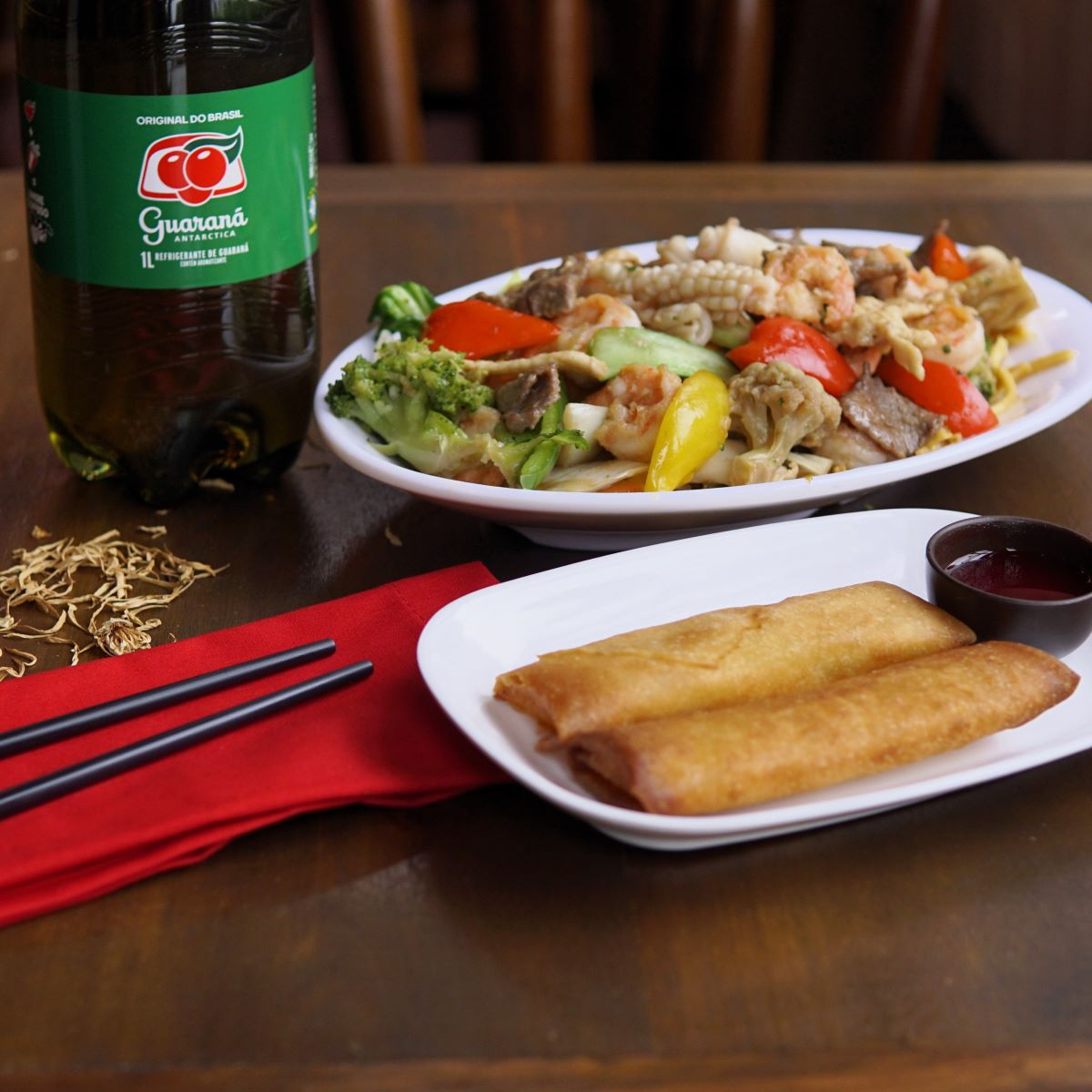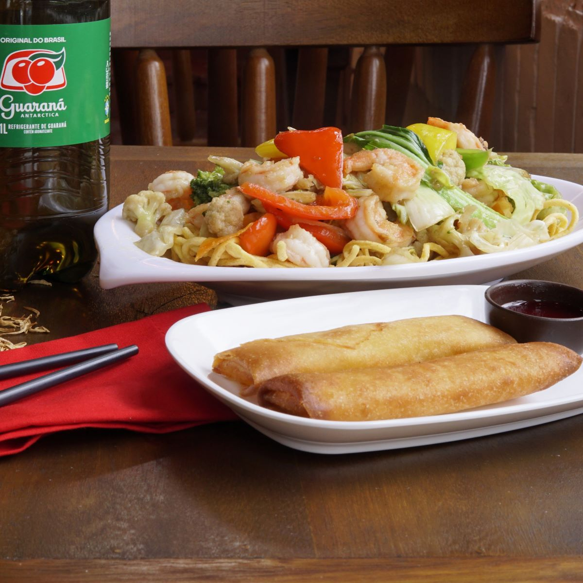 Desfrute de um yakisoba de camarão, com uma mistura de legumes frescos e camarão suculento +2 rolinhos a sua escolha e 1 Guaraná Antartica de 1 litro.