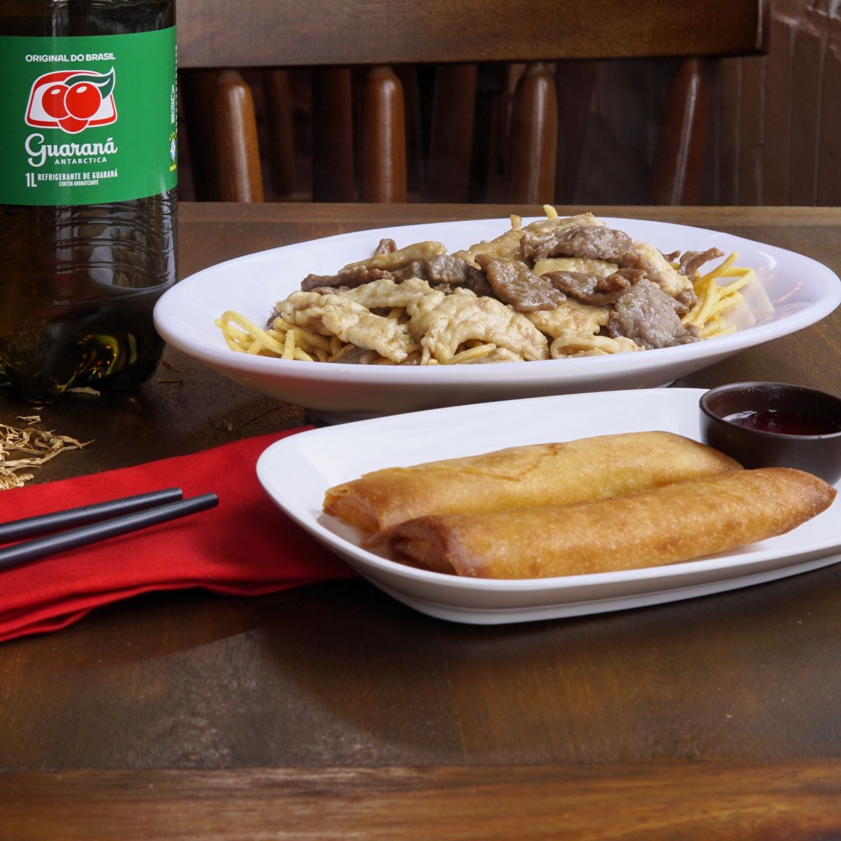 Experimente um yakisoba suculento com carne e frango, enriquecido com cinco tipos de legumes +2 rolinhos a sua escolha e 1 guaraná Antartica de 1 litro.