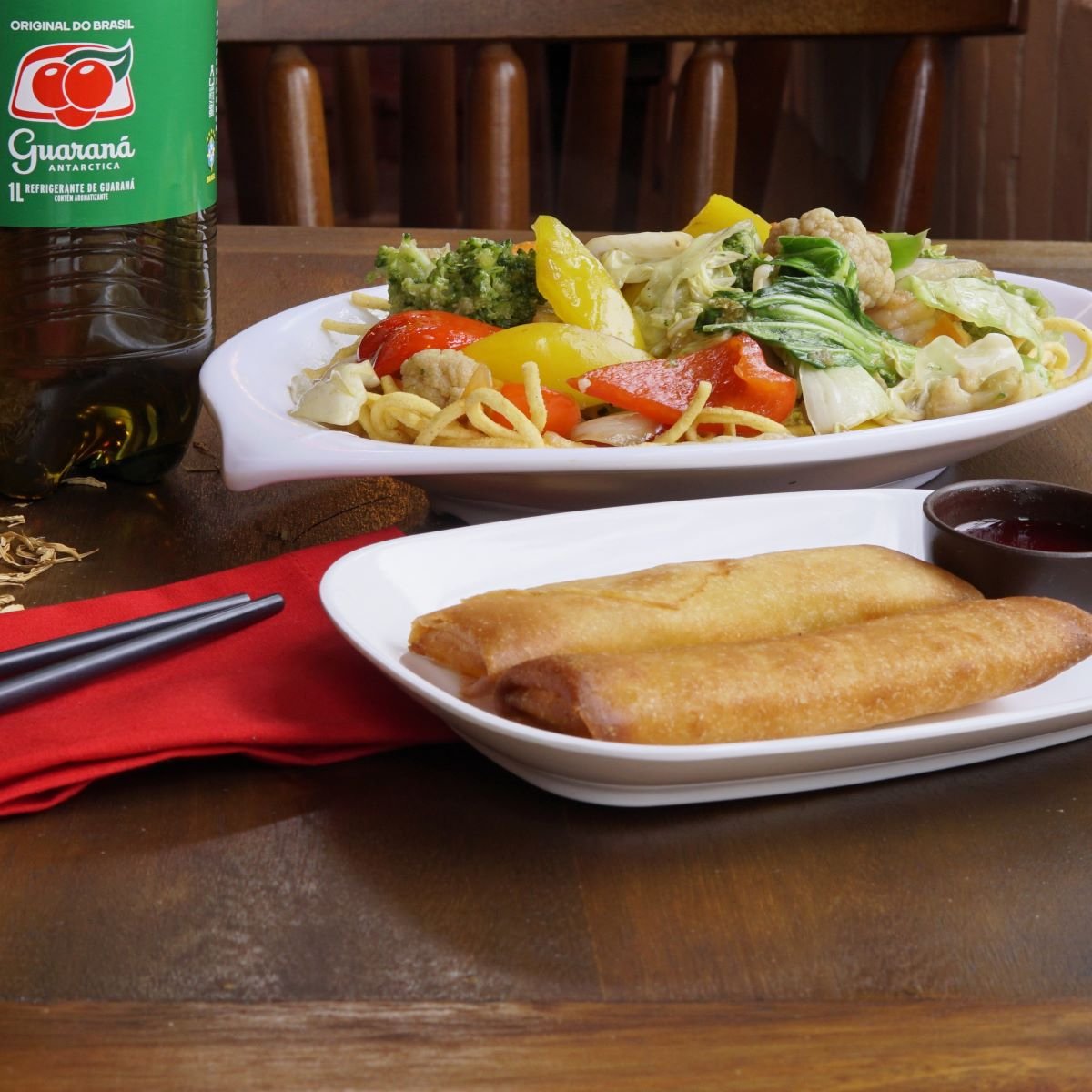 Opção vegetariano o yakisoba vem repleto de legumes frescos e crocantes, acompanhado de 2 rolinhos a sua escolha e um Guaraná Antartica de 1 litro para completar a refeição.