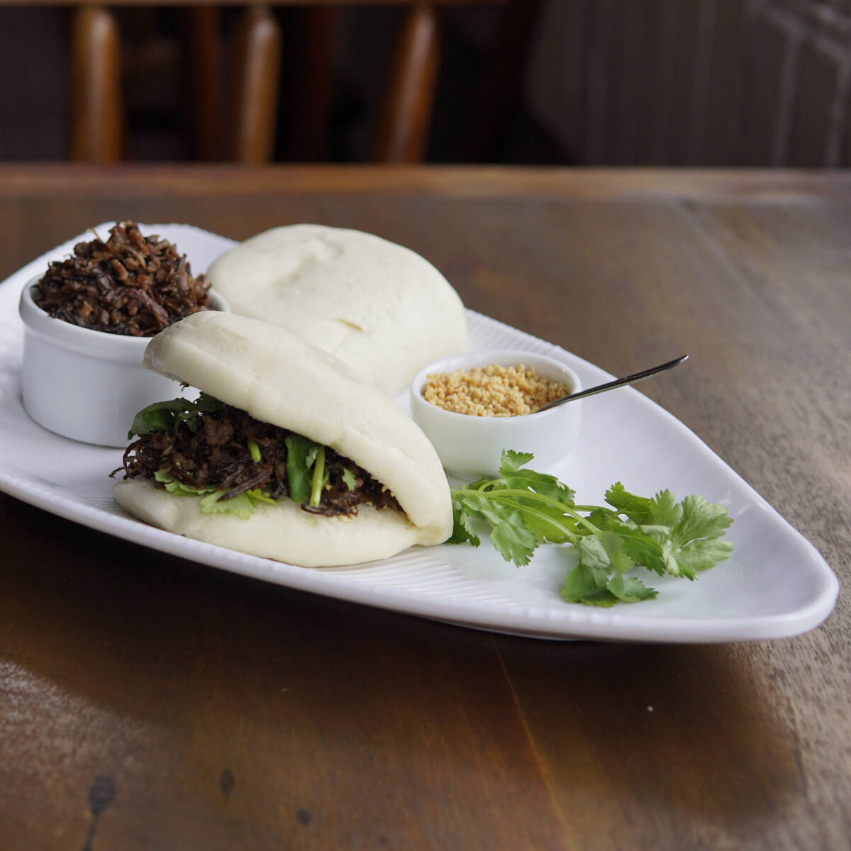 Experimente a nossa versão do Gua Bao. Recheio de carne suína com mínima parte de panceta lentamente cozida a folhas de mostarda seca chinesa. São 2 Gua Bao para serem montados. Amendoim adocicado e coentro a gosto.