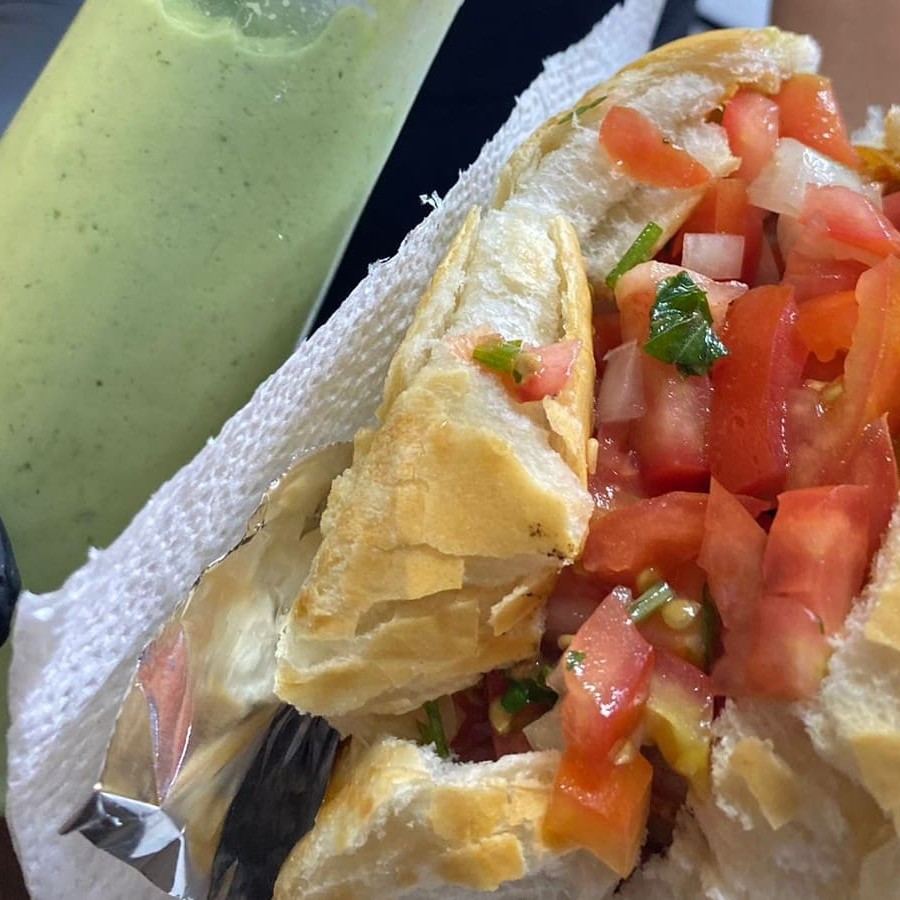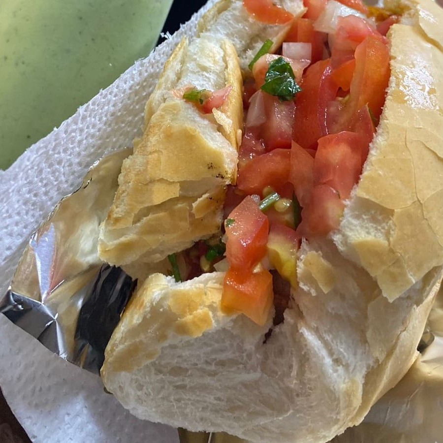 Delicioso Lanche de Linguiça, uma especialidade da categoria 'Lanches de Espetinho'. Este lanche é preparado com um pão francês fresquinho e crocante, recheado com um espetinho de linguiça suculento e saboroso. Acompanha um vinagrete vibrante de tomate e cebola, que adiciona um toque fresco e contrastante ao prato. Para finalizar, um delicioso molho verde caseiro cobre a linguiça, proporcionando um sabor picante e agradável que realça ainda mais o sabor da linguiça. Uma refeição rápida e deliciosa, perfeita para qualquer momento do Dia.
