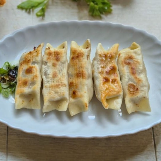 Pastéis chineses fritos com recheio de repolho e carne suína. Acompanha um sachê de shoyu.