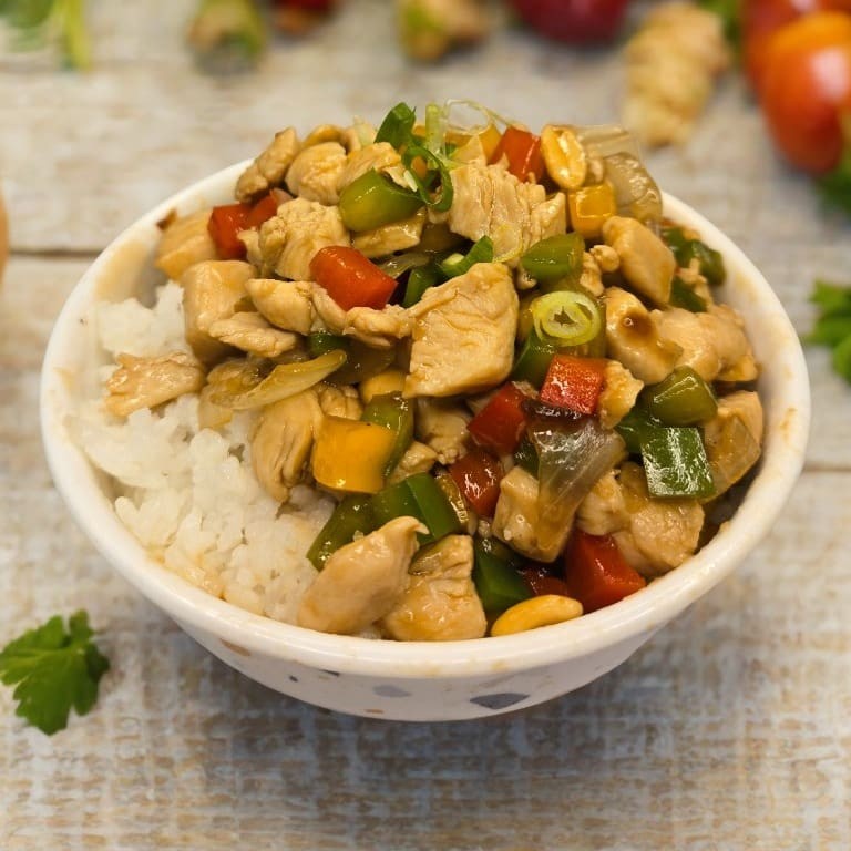 Frango xadrez ao molho oriental com pimentões, cebola e amendoim. Arroz a sua escolha. Peso aproximado : 550g