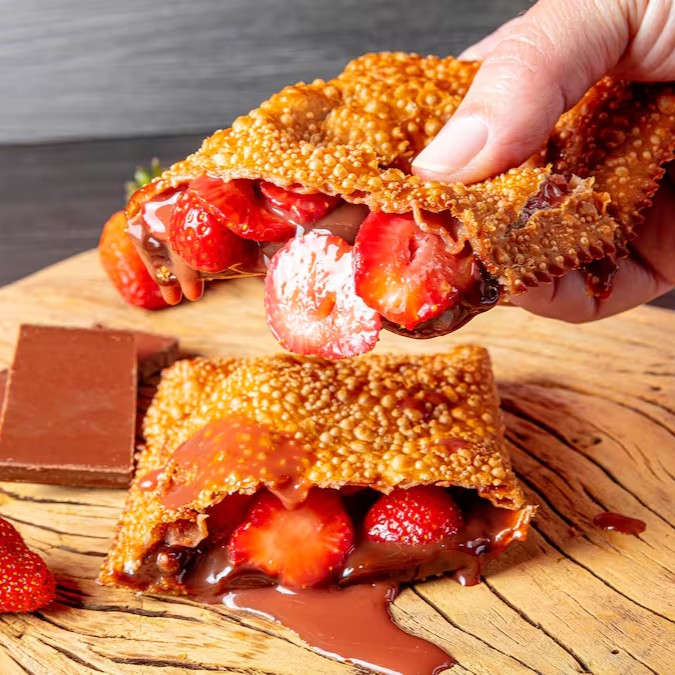 Chocolate ao leite com morangos frescos fatiado derretido na nossa massa de cacau