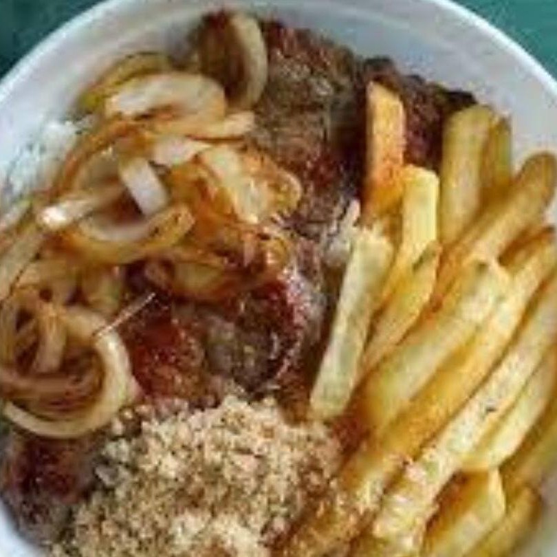 Bife acebolado acompanha arroz, feijão, salada e batata frita