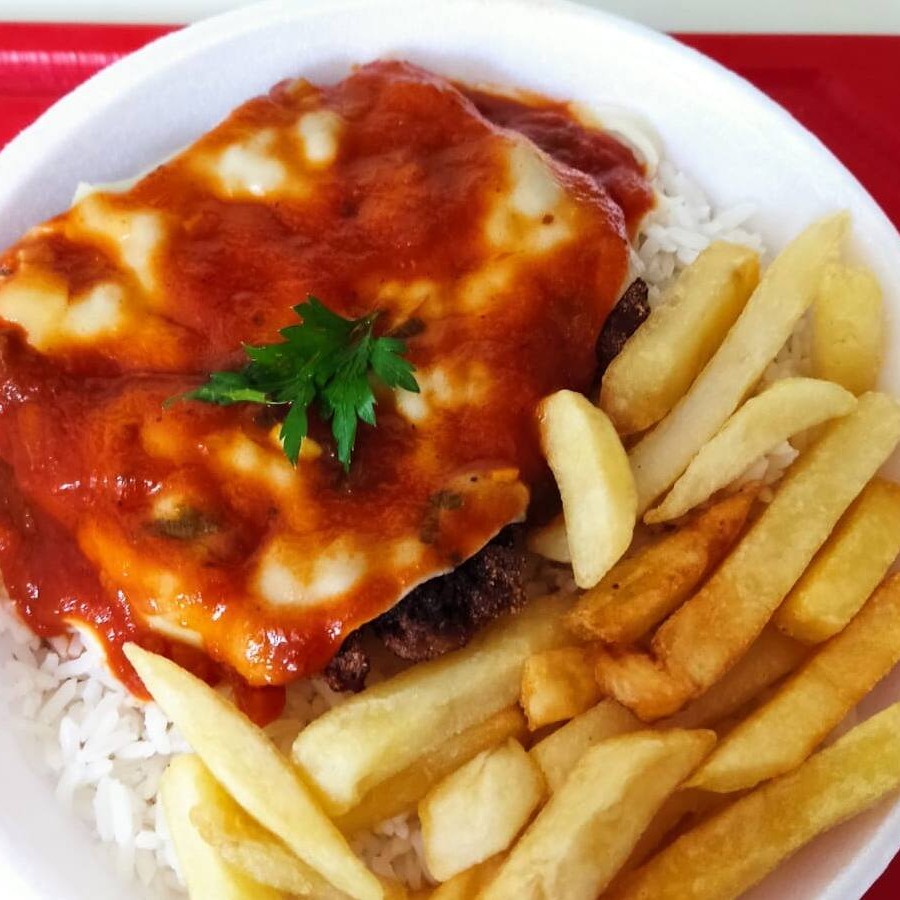 Saboreie um Marmitex de Bife à Parmegiana excepcionalmente saboroso. Este prato, cuidadosamente preparado, traz um bife suculento e tenro, coberto com um delicioso queijo derretido, acompanhado de um arroz branco e soltinho, um feijão caseiro e aromático, batatas fritas crocantes e uma salada fresca e colorida. Uma combinação perfeita para um almoço nutritivo e cheio de sabor. Experimente este deleite culinário!